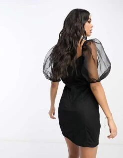 Lace & Beads Exclusive Sheer Puff Sleeve Bodycon Mini Dress In Mixed Applique For Women Multi-colour