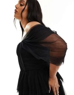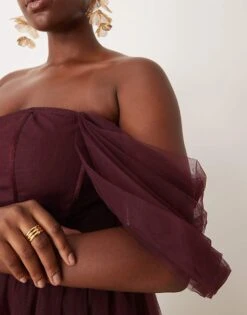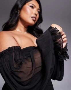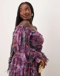 Lace & Beads Plus Lace And Beads Plus Long Sleeve Tulle Ruffle Maxi Dress In Purple Floral For Women