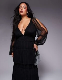 Lace & Beads Plus Sheer Sleeve Tiered Tulle Maxi Dress In Black For Women